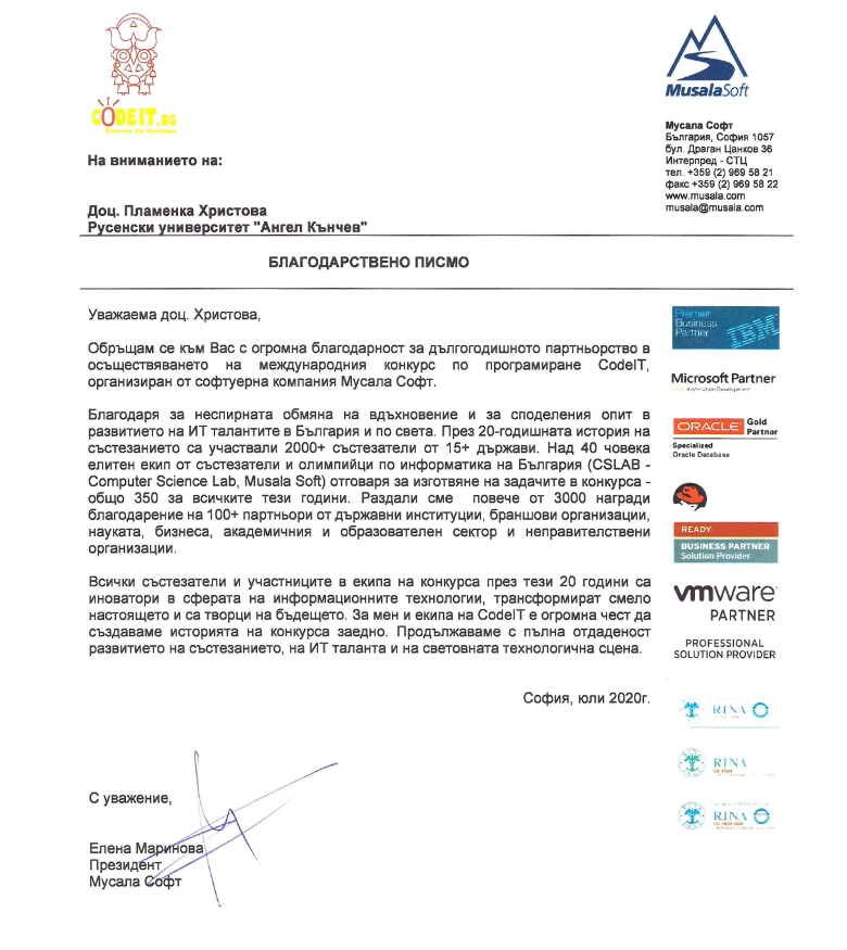 КОМПЮТЪРНИ НАУКИ, ИНФОРМАТИКА И ИНФОРМАЦИОННИ ТЕХНОЛОГИИ В БИЗНЕСА, СОФТУЕРНО ИНЖЕНЕРСТВО. Гости на събитието бяха Ректорът на Университета чл. -кор. дтн проф. Христо Белоев, доц. д-р Десислава Атанасова - декан на Факултет ПНО, доц. д-р Десислава Стоянонова - зам. декан по УР и официалния представител на "Мусала Софт" маг. инж. Иво Русев.