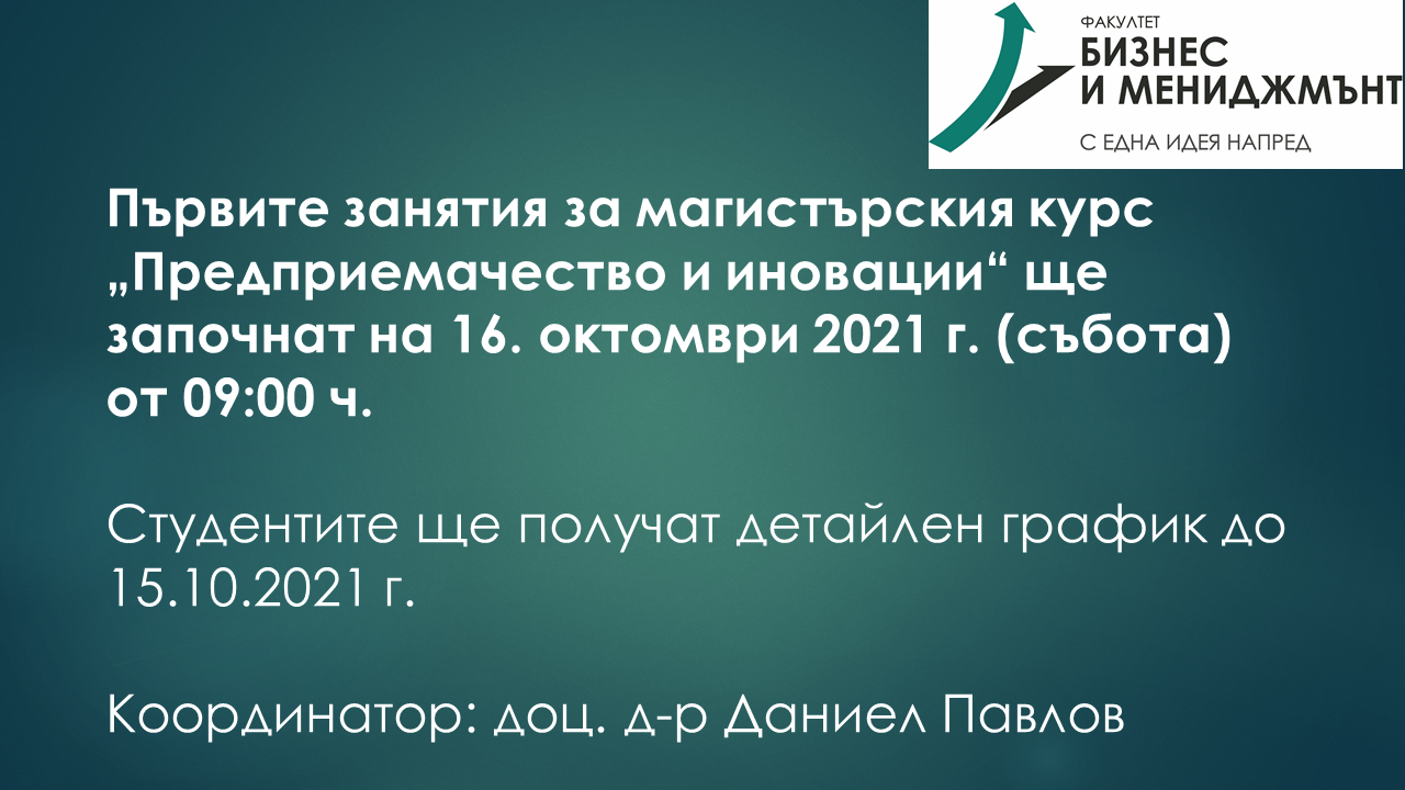 На 15. януари 2021 г. лекторите от Факултет "Бизнес и мениджмънт" доц. д-р Даниел Павлов и гл. ас. д-р Ирина Костадинова проведоха иновативен урок по предмета Предприемачество като поканиха на среща русенския предприемач Явор Йотов. Цялата новина.